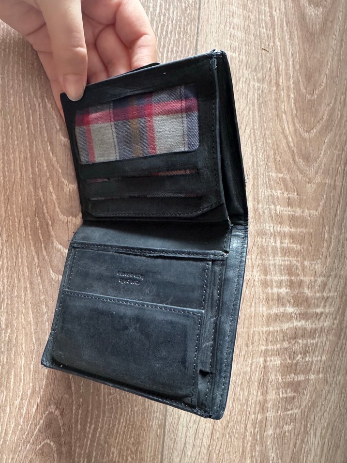 Siyah deri erkek cüzdanı, çıtçıtlı kapama ve ekose kumaş astarla. Kart ve nakit için birden çok bölmesi bulunur.