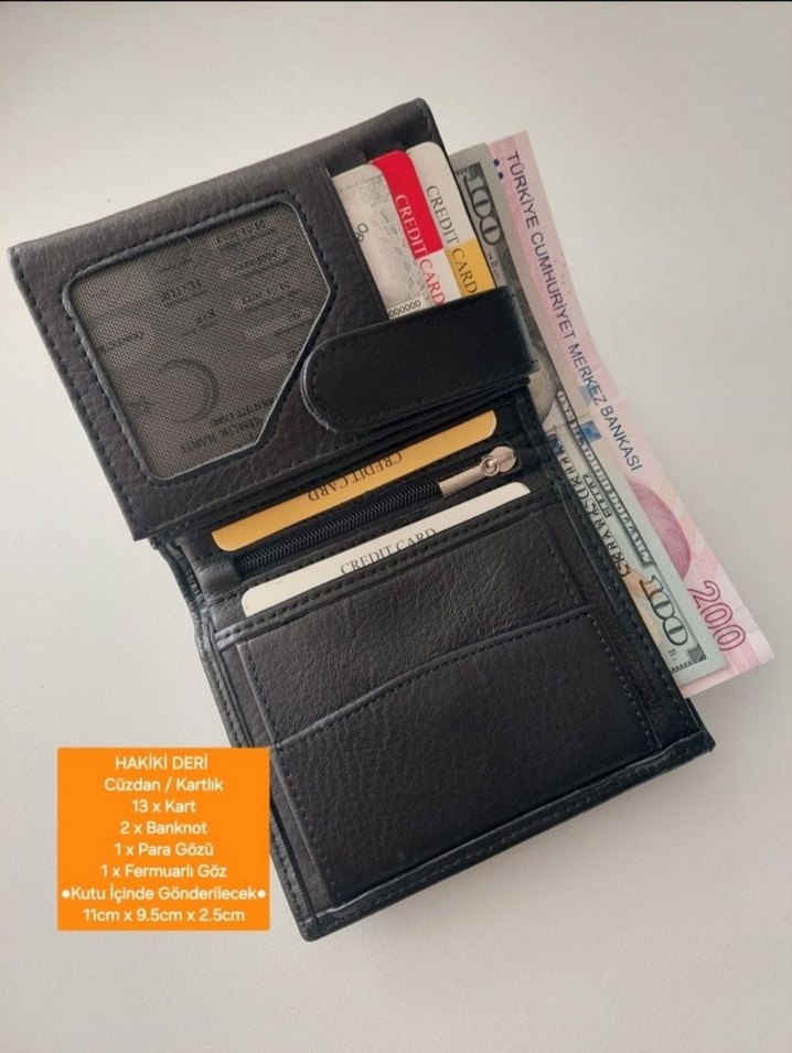 Siyah deri erkek cüzdanı, çoklu kart yuvası, şeffaf kimlik penceresi ve banknot bölmeleri içerir. Ölçüleri 11x9.5x2.5 cm'dir ve düzenli saklama sağlar.