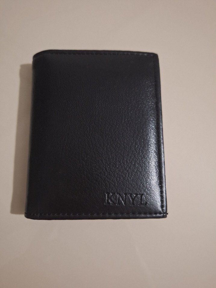 Düz siyah deri erkek cüzdanı, sade tasarıma sahip ve KNYL logosu kabartmalı olarak yer alıyor.