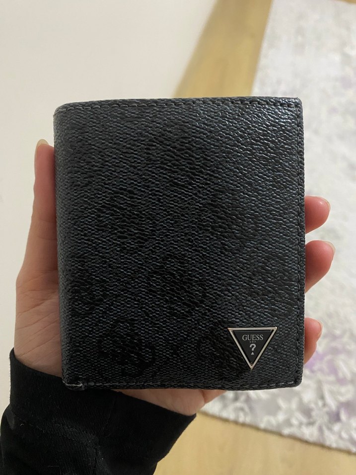 Günlük kullanım ve iş ortamları için uygun, tokalı tasarıma ve hafif baskılı desene sahip siyah deri erkek cüzdanı. Guess logosu bulunur. Orijinal Ürün