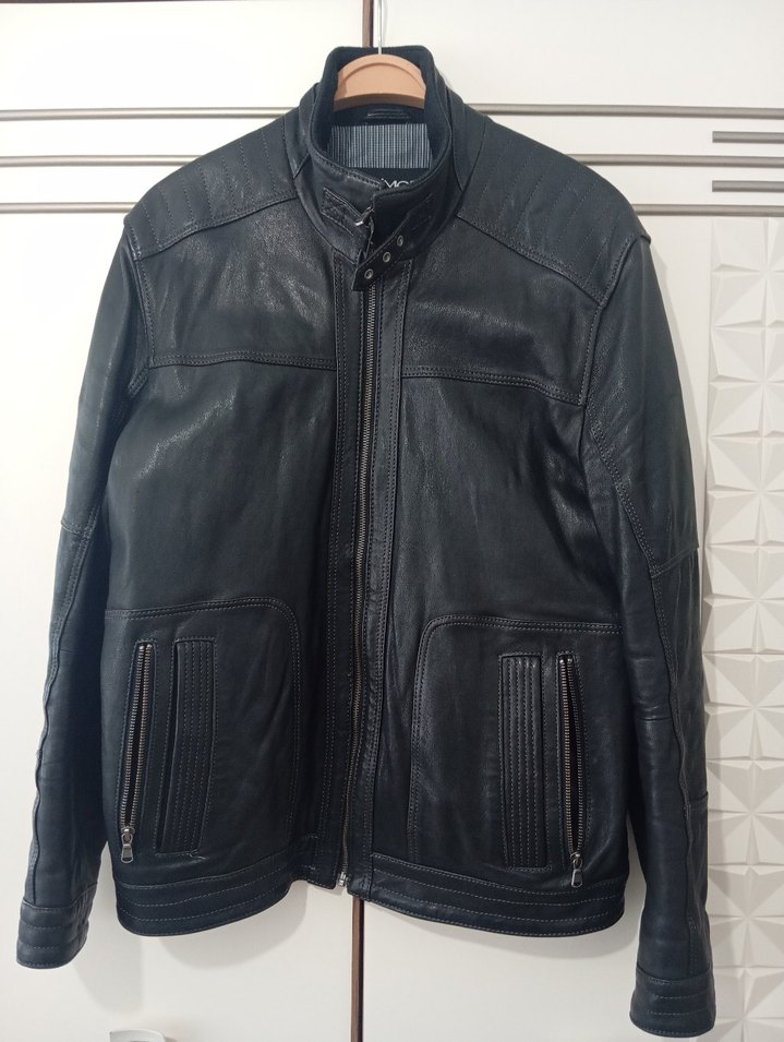 Siyah deri erkek Derimod deri ceket, sadece iç kısmında leke var ve sağ ve sol iç kısımlarda hafif sökükler var onun dışında sorunsuz kurutemizleme yapılırsa daha iyi olur fiyatı o yüzden makul tuttum ikikoltukaarası:55 cm boy:71 cm