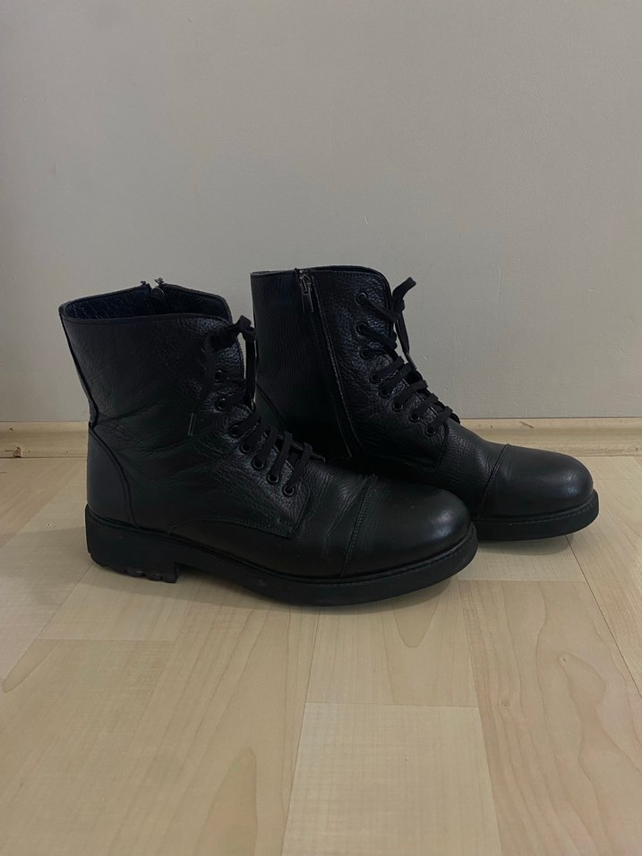 Siyah deri erkek botları, gotik tarzda, desensiz ve koyu renkte. Günlük kullanım için uygun, rock punk havası ve zahmetsiz şıklık sunar.