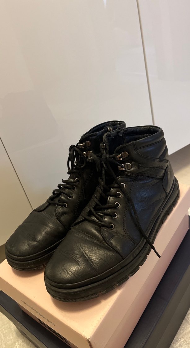 Siyah deri, bağcıklı erkek botları, günlük sokak stili için uygun. Rahat taban ve sağlam yapıya sahip.