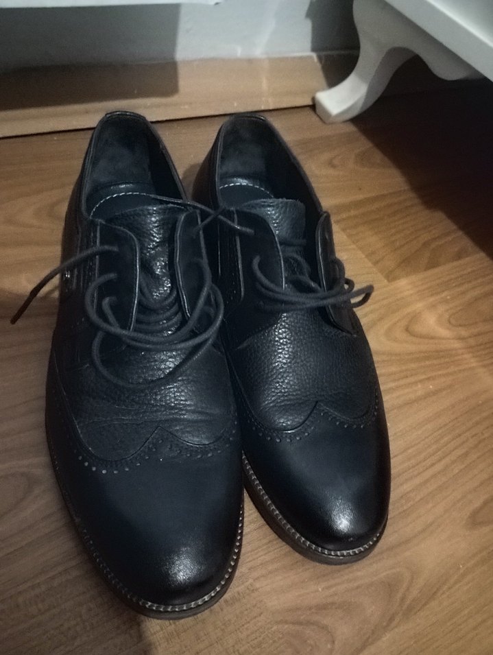 Ofis için uygun, siyah deri erkek klasik ayakkabı. Bağcıklı ve desen içermeyen yüzeye sahip, gotik tarzda tasarlanmıştır.