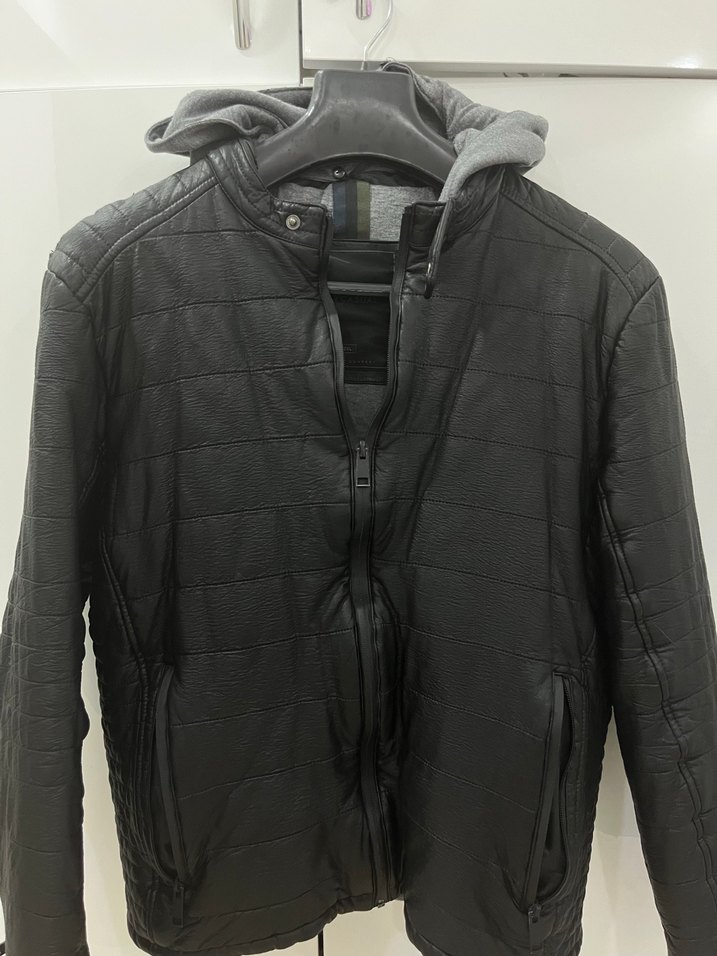 Fermuarlı cepli, kapüşonlu ve siyah deri erkek mont, normal midi boyda ve uzun kolludur. Şehir tarzı için uygun, şık ve rahat bir modeldir. Deformesi var