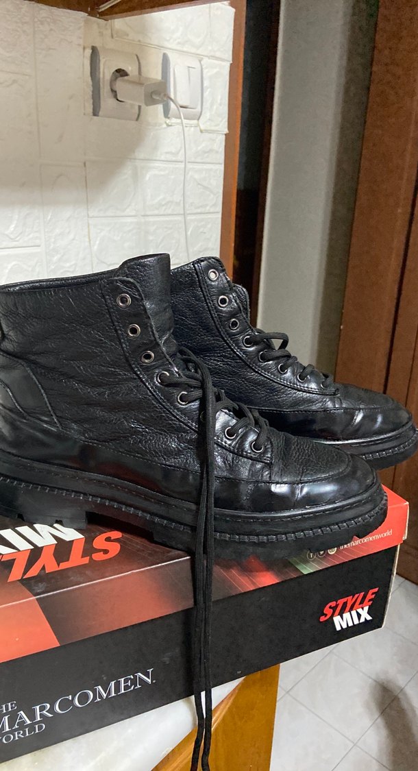 Siyah deri erkek bot, bağcıklı tasarıma sahip. Koyu renkli ve desensiz yüzeyiyle rock punk tarzını yansıtır. Günlük kullanım için uygundur.