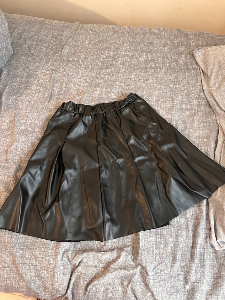 Siyah deri pilili midi etek, loose fit ve gotik stile uygun. Günlük kullanım için şık ve avangart bir görünüm sunar. kız çocuk 9-10-11 yaşa uygun