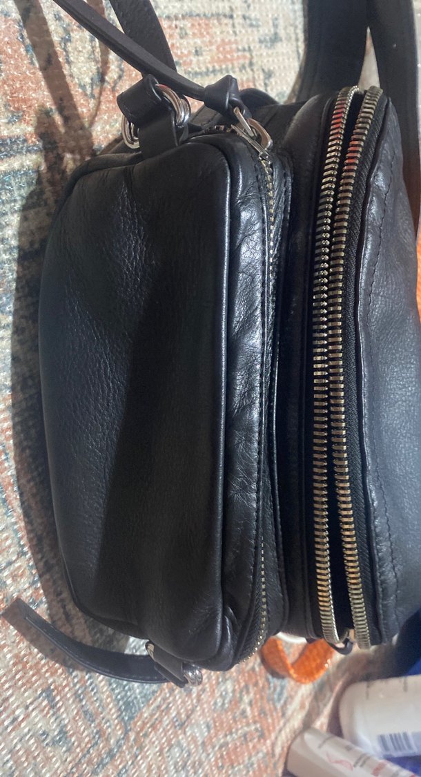 Siyah deri, fermuarlı bölmeli biker tarzı çanta, şık ve desensiz tasarımıyla günlük kullanıma uygun.
