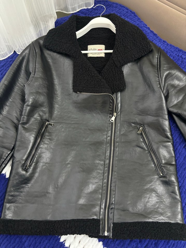 Siyah deri biker ceket, fermuarlı cepler ve notched yaka ile. Uzun kollu, fitted ve midi boyda, sokak stiline uygun.