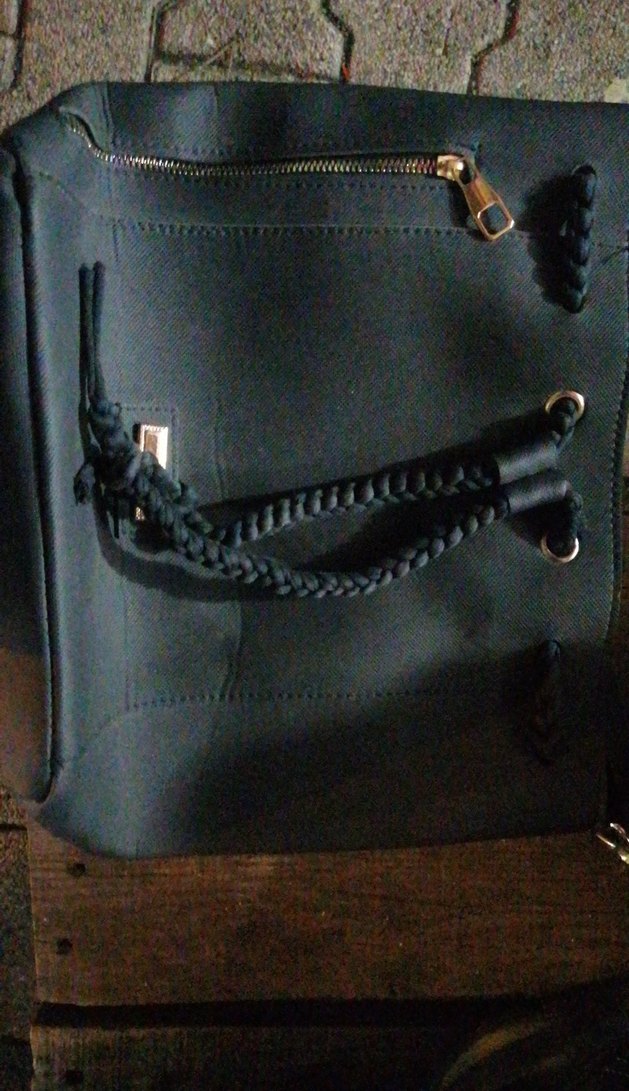 Siyah deri, fermuarlı ve örgülü saplı biker kadın çantası, minimalist ve şık tasarıma sahip, günlük kullanım için uygun.
