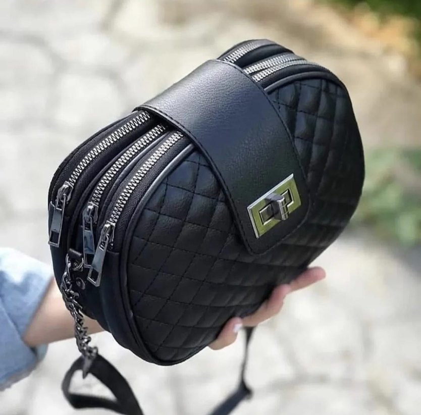 Siyah deri ve kapitone desenli, çoklu fermuarlı bölmeleri olan kadın çantası. Klasik şıklık ve biker tarzını birleştirir, günlük kullanıma uygundur.