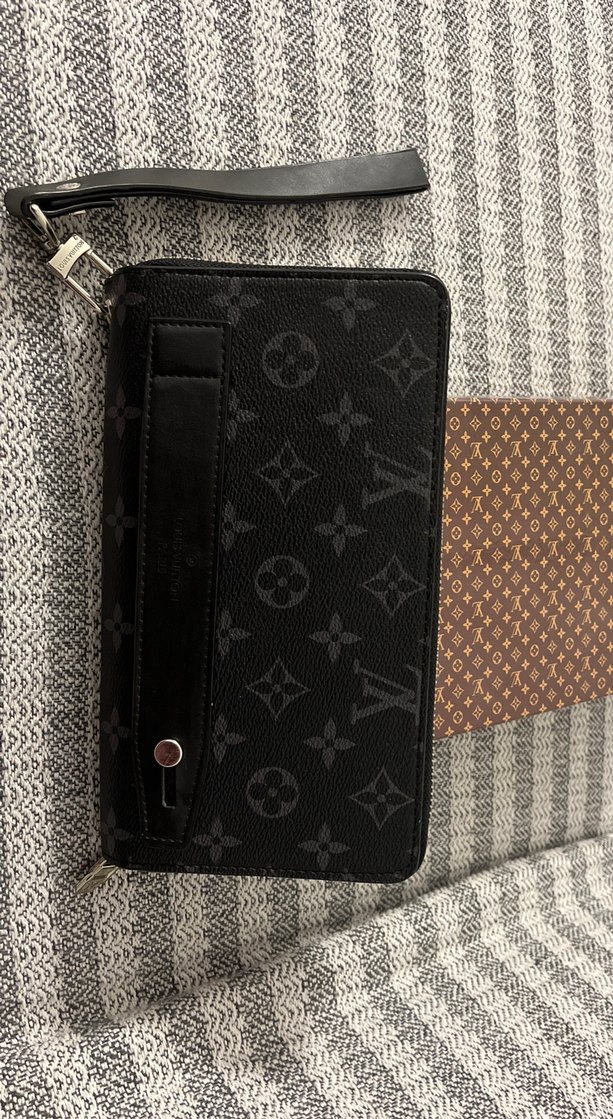 Siyah deri, baskılı desene sahip fermuarlı clutch cüzdan, bilek askısı ile kolay taşınır. Genç ve trend sokak stili için uygundur.