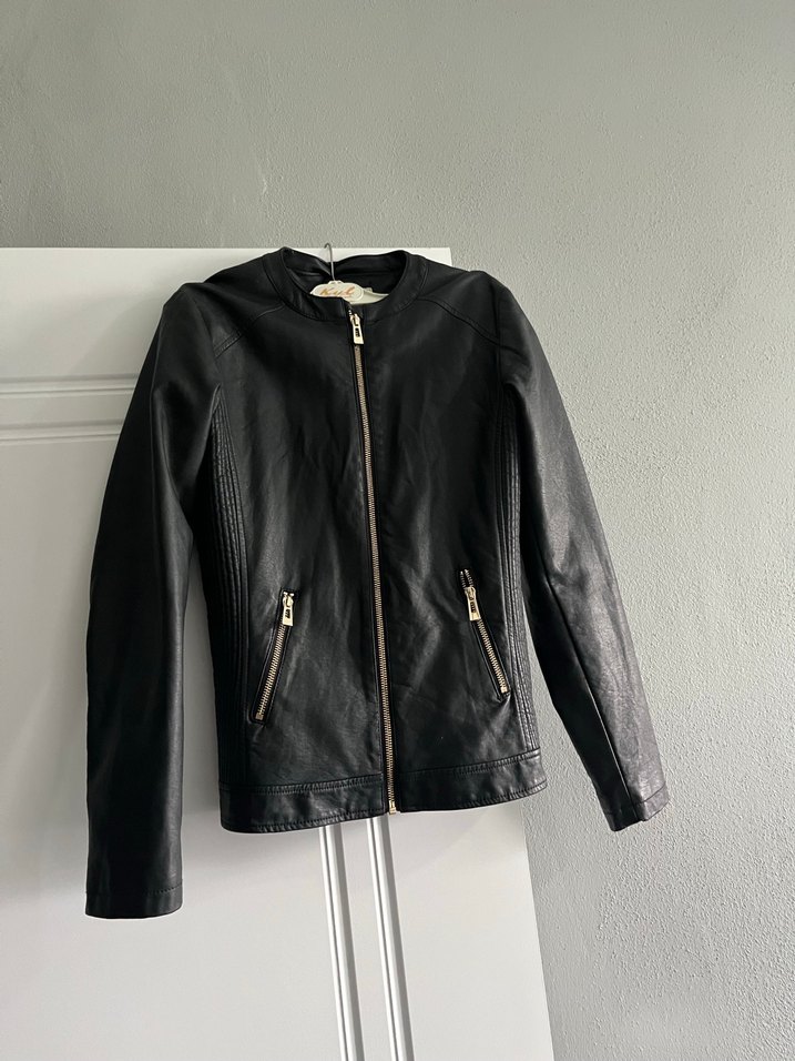 Siyah deri, fermuarlı biker ceket, yüksek yakalı ve uzun kolludur. Normal midi boyda, günlük şık kullanıma uygundur. 13-14 yaş için uygundur