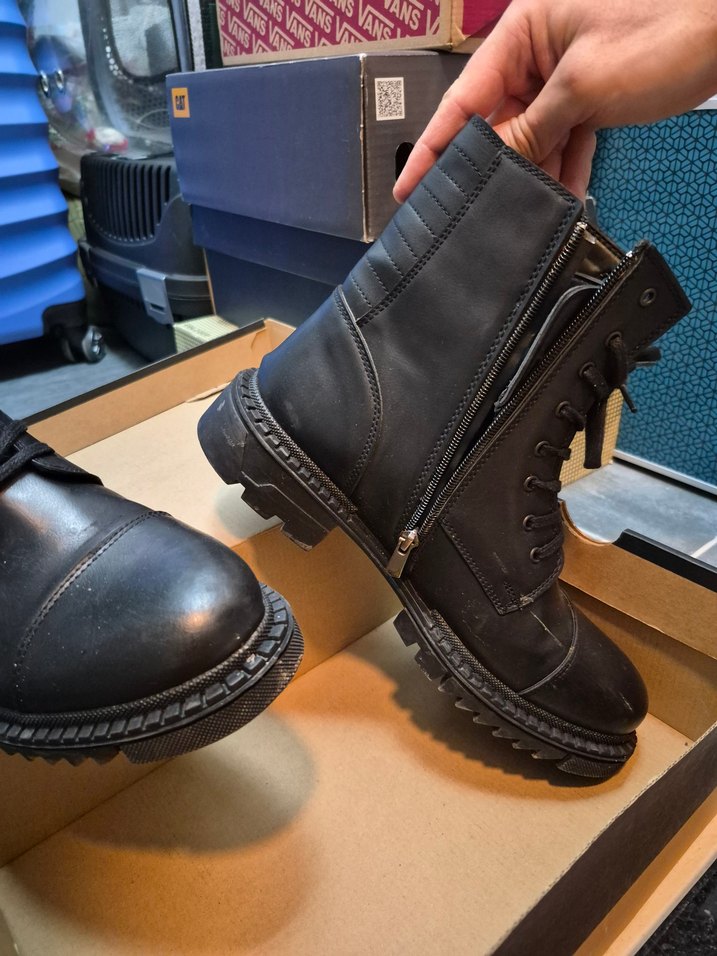 neredeyse hiç giymedim. siyah deri, blok topuklu ve fermuarlı botu. Sokak tarzı ve günlük kullanım için uygun, rahat ve şık.