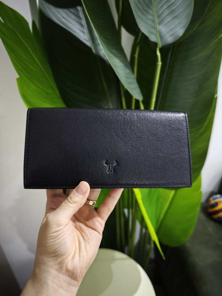 Bu siyah deri cüzdanı, düz yüzeyiyle klasik zarafeti gotik stil ile birleştirir, günlük kullanım için uygundur. yeni etiketli. mıknatıslı