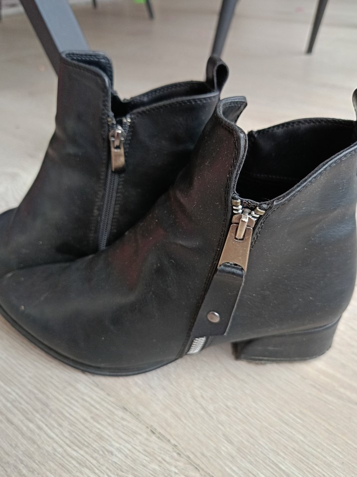 Siyah deri kadın botu, fermuarlı ve blok topuklu. Düz yüzeyi ve fermuar kapamasıyla günlük kullanıma uygun rahat tasarım. Taban kısmı aşınmış ama o da değişebilir