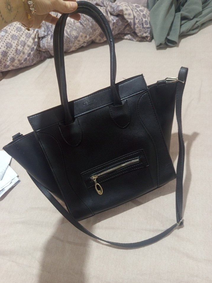 Siyah deri kadın çanta, fermuarlı ön cep, çift saplı ve çıkarılabilir omuz askılı çağdaş tasarıma sahip. Günlük kullanıma uygun, desensiz şık model.