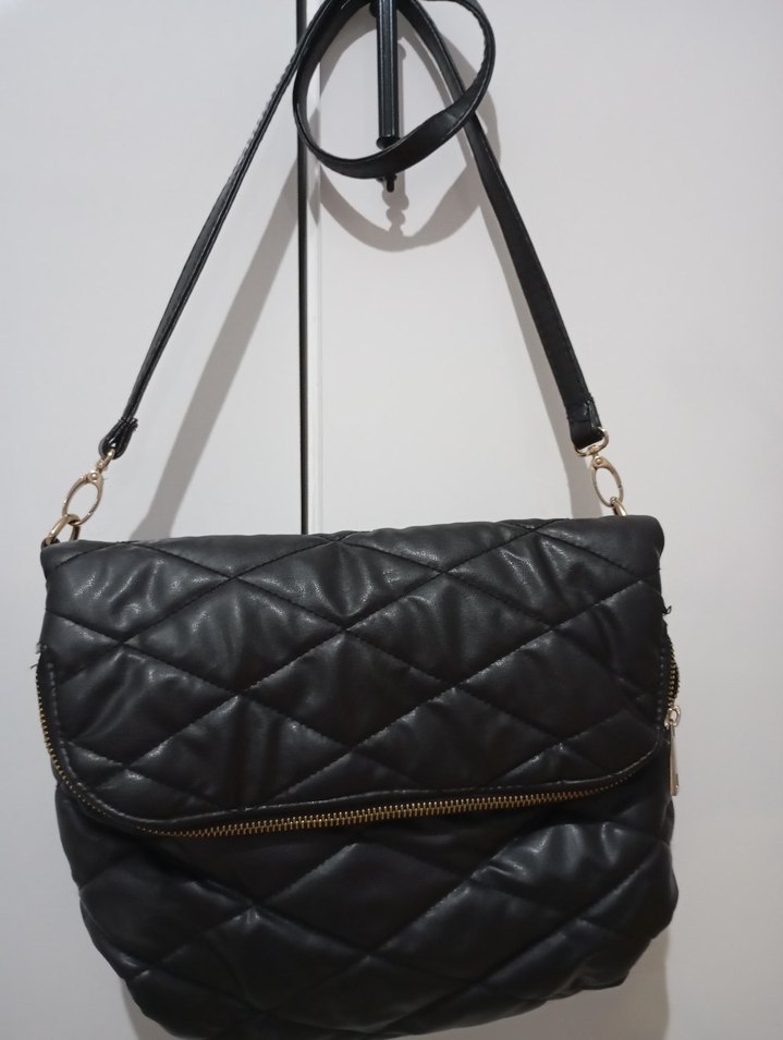 Siyah deri ve fermuarlı, kapitone desenli kadın çanta. Ayarlanabilir askısı ile günlük kullanıma uygun, şık ve rahat.