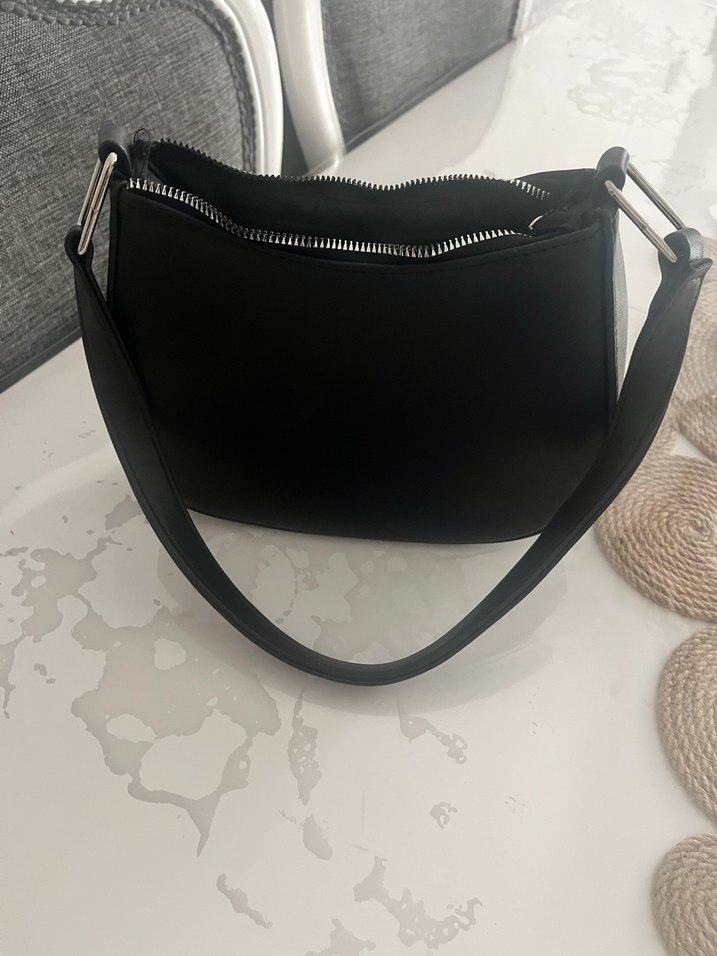 Siyah deri, fermuarlı kadın çantası, minimalist ve trend sokak stili için uygundur. Günlük kullanım için idealdir.