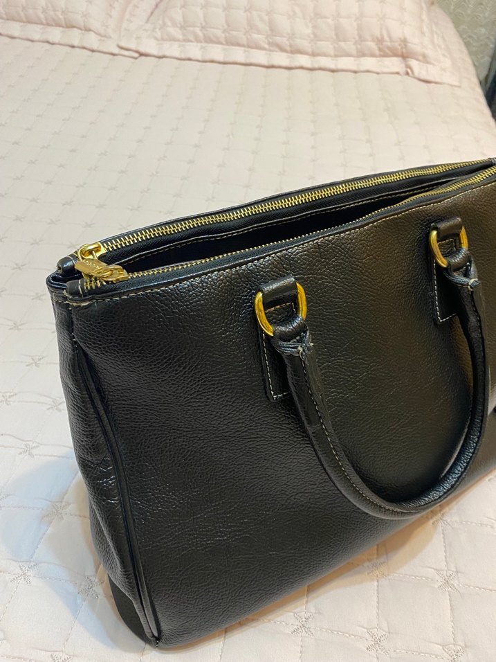 Siyah deri, fermuarlı kapama ve sağlam saplara sahip kadın çanta. İş ve ofis kullanımı için klasik ve şık tasarım.