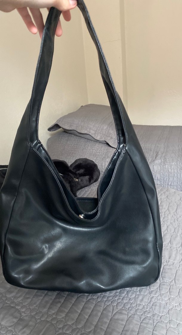 Siyah deri malzemeden yapılmış, fermuarlı ve minimalist goth tarzında kadın çantası. Düz yüzeye sahip olup günlük kullanıma uygundur.