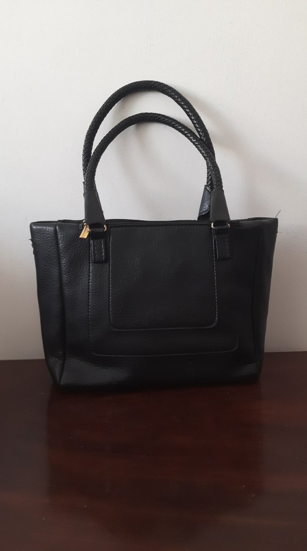 Siyah deri, fermuarlı kapama ve örgülü saplara sahip kadın çanta, klasik şıklığı çağdaş tarzla buluşturur.