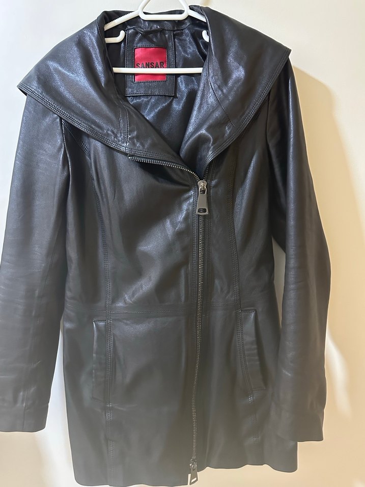 Siyah deri, fermuarlı, uzun kollu, normal uzunlukta ve dar kesim kadın ceket. Notched lapel yakasıyla sokak stiline uygun.