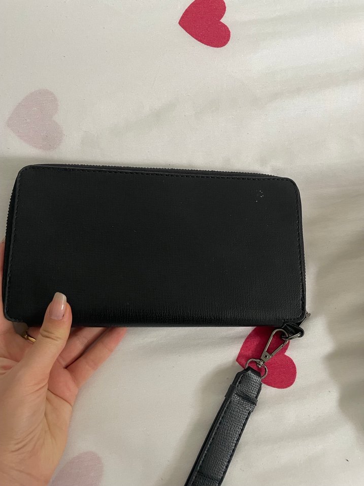 Siyah deri fermuarlı clutch cüzdan, minimalist ve desensiz tasarıma sahiptir. Genç, trendi ve gündelik goth tarzına uygundur.