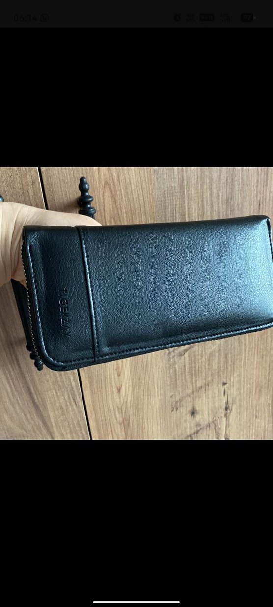 Siyah deri, fermuarlı kadın cüzdanı, günlük kullanıma uygun modern klasik tarzda, desensiz yüzeye sahip. Üzerinde "T.GERZ." yazısı bulunur. emi:9cm, boy:19cm
