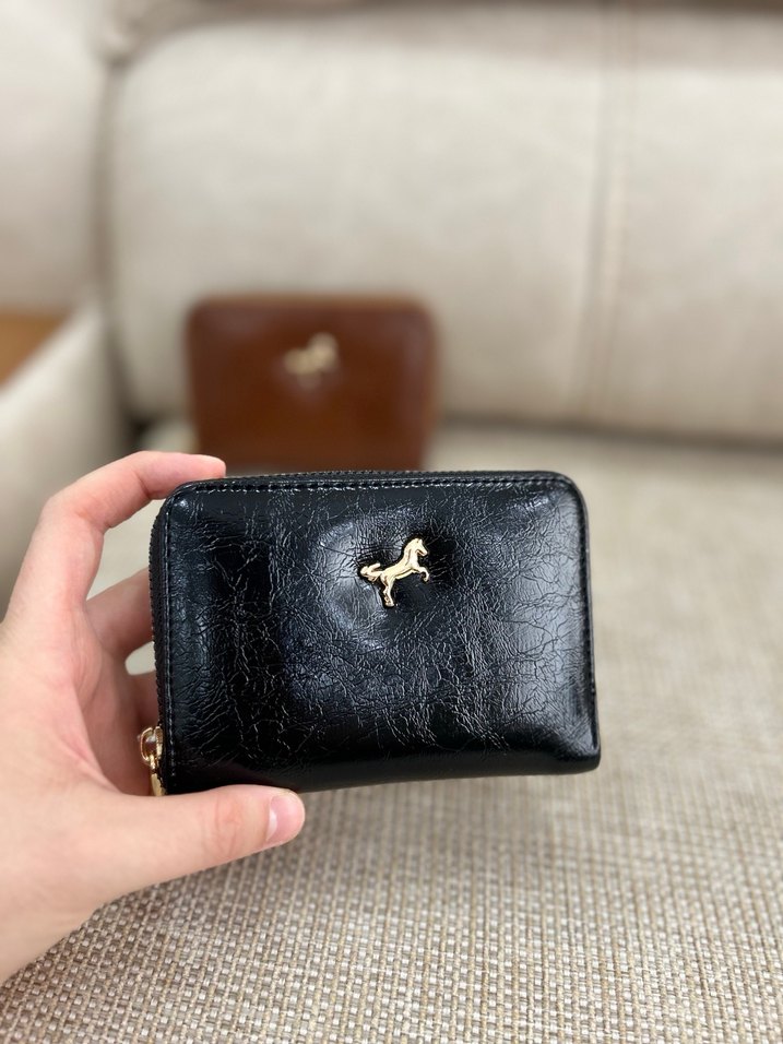 Küçük metal figürlü, fermuarlı siyah deri kadın cüzdanı. Dokulu yüzeye sahip, günlük kullanıma uygun.