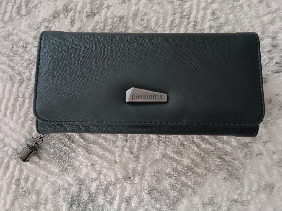 Siyah deri, fermuarlı kadın cüzdanı. Ofis için modern klasik tarzda, üzerinde "passionis" marka metal plaka bulunur.