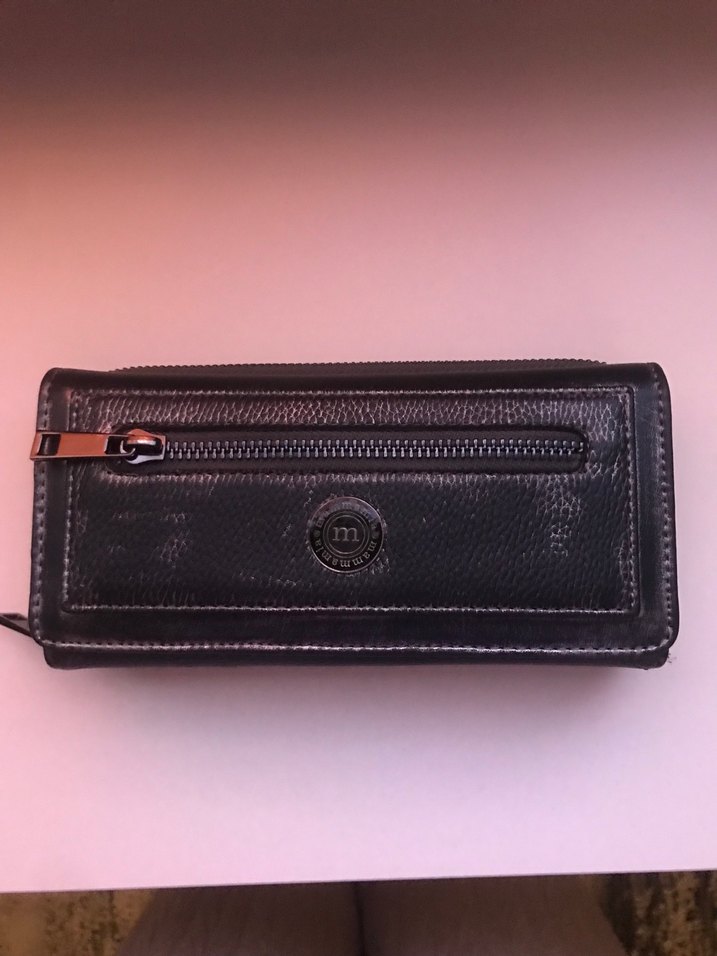 Siyah deri, fermuarlı cep ve biker tarzıyla sade kadın cüzdanı. Günlük kullanıma uygundur.