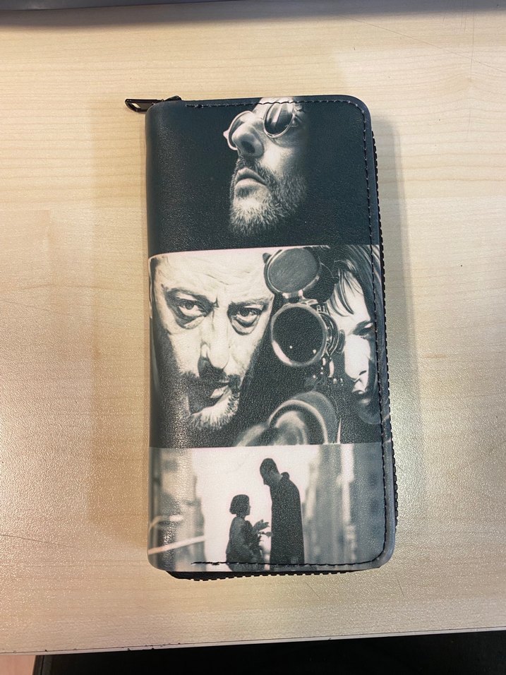 Siyah deri, fermuarlı kadın cüzdanı, baskılı karşı kültür görselleriyle günlük kullanım için uygun, sokak stili havasında.