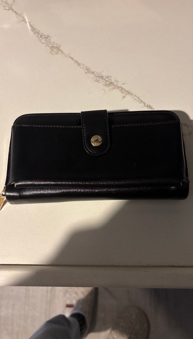 Siyah deri kadın cüzdanı, fermuarlı ve çıtçıtlı kapamasıyla modern klasik tarzda, günlük kullanıma uygun.