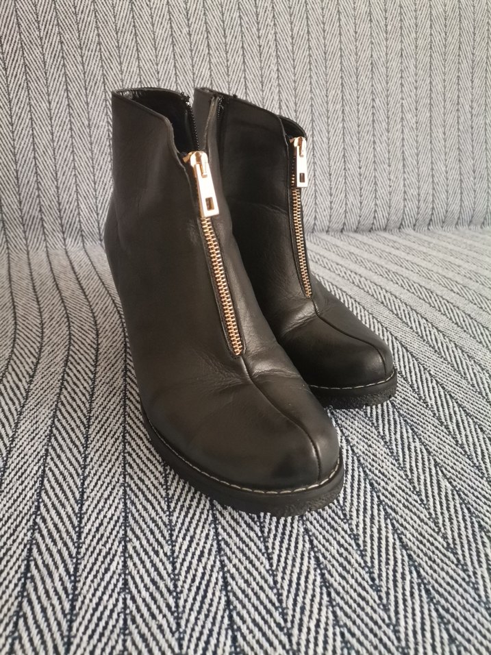 markası ricardocolli .Siyah deri, ön fermuarlı kadın botları, dolgu topuklu, günlük kullanım ve sokak stiline uygun. en fazla iki kez kullanıldı. artık topuklu giyemiyorum. herhangi bir sorunu yoktur. gerçek deridir. kutusunda muhafaza edilmiştir.