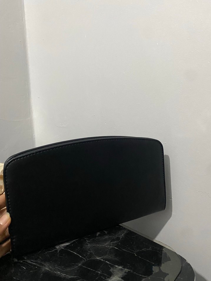 Siyah deri ve fermuarlı kapama özellikli, minimalist tasarımlı kadın portföy cüzdan. Günlük kullanım için uygun, desensiz ve çağdaş stilde.