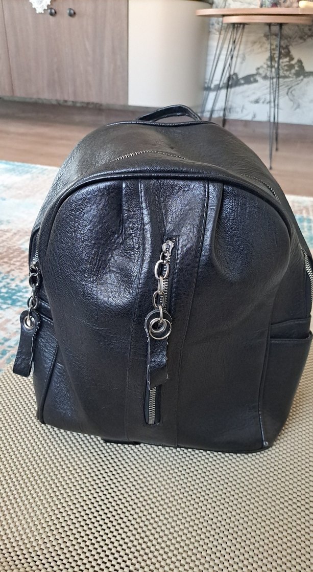 Siyah deri, fermuarlı ve biker tarzında kadın sırt çantası. Günlük kullanıma uygun, sade ve desen içermeyen tasarıma sahiptir.