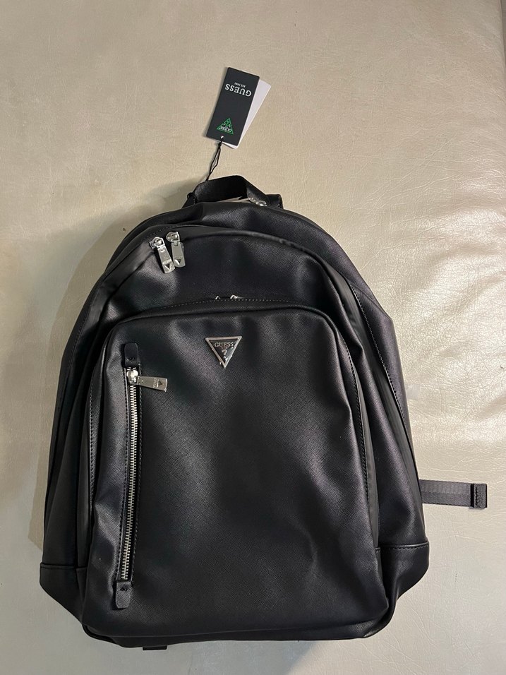 Bu siyah deri sırt çantası, fermuarlı cepleri ve minimalist baskılı tasarımıyla trend günlük sokak stiline uygundur.