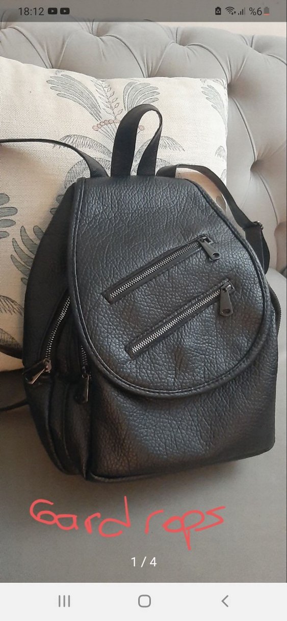 Siyah deri, fermuarlı cepleri olan, minimalist biker tarzında günlük kullanıma uygun kadın sırt çantası .
