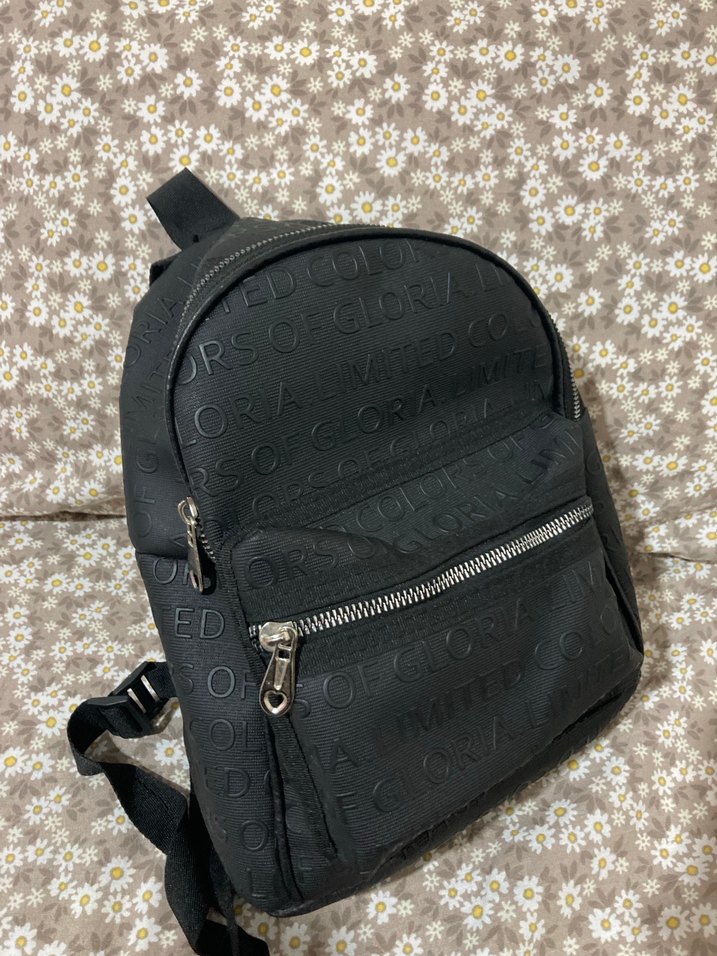 Siyah deri sırt çantası, fermuarlı ön cep ve kabartmalı yazılarla minimal ve günlük kullanıma uygun
