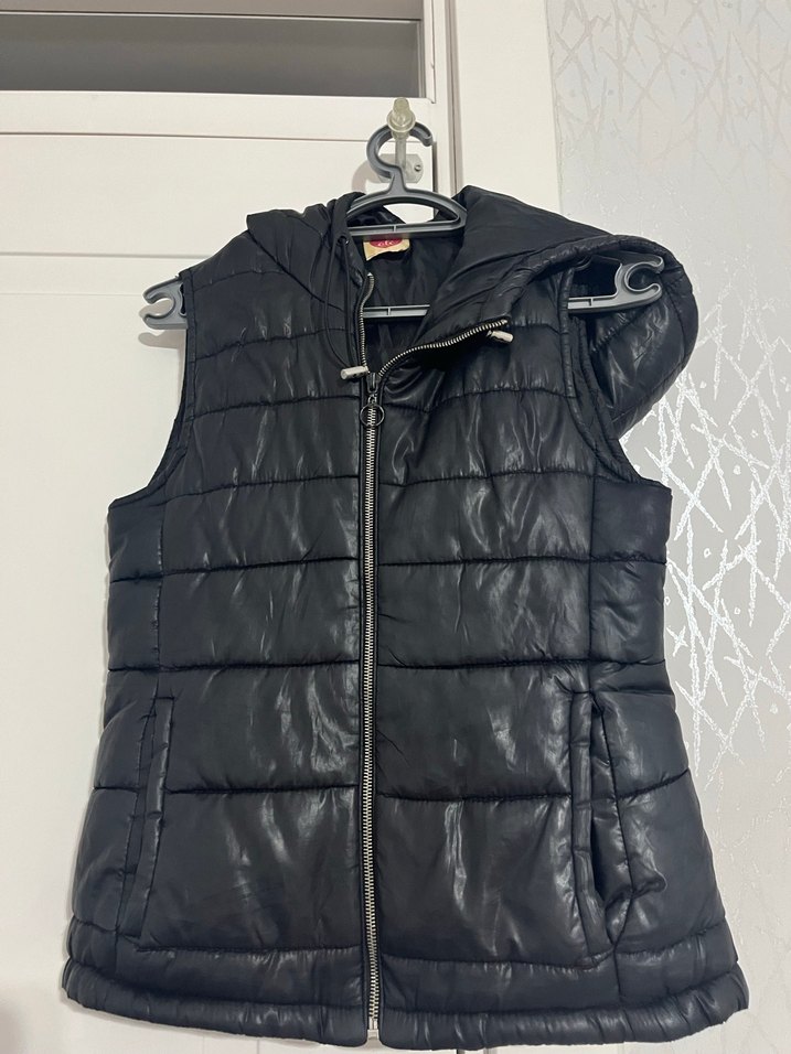 Fermuarlı, yüksek yakalı ve kolsuz siyah deri yelek. Normal midi boyda, desen içermeyen, sokak stiline uygun şık tasarım.