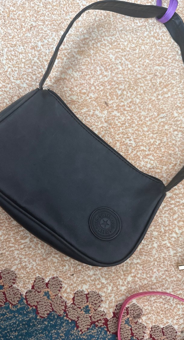 Siyah deri kadın çanta, fermuarlı ve minimal tasarıma sahip. Baskılı detayları ile trend sokak stiline uygun şık bir parça.