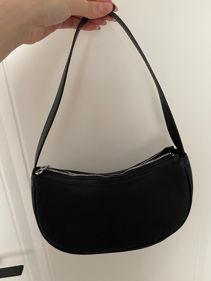 Siyah deri, fermuarlı ve minimalist tasarıma sahip kadın çantası, günlük kullanım için uygun goth stilini yansıtıyor.