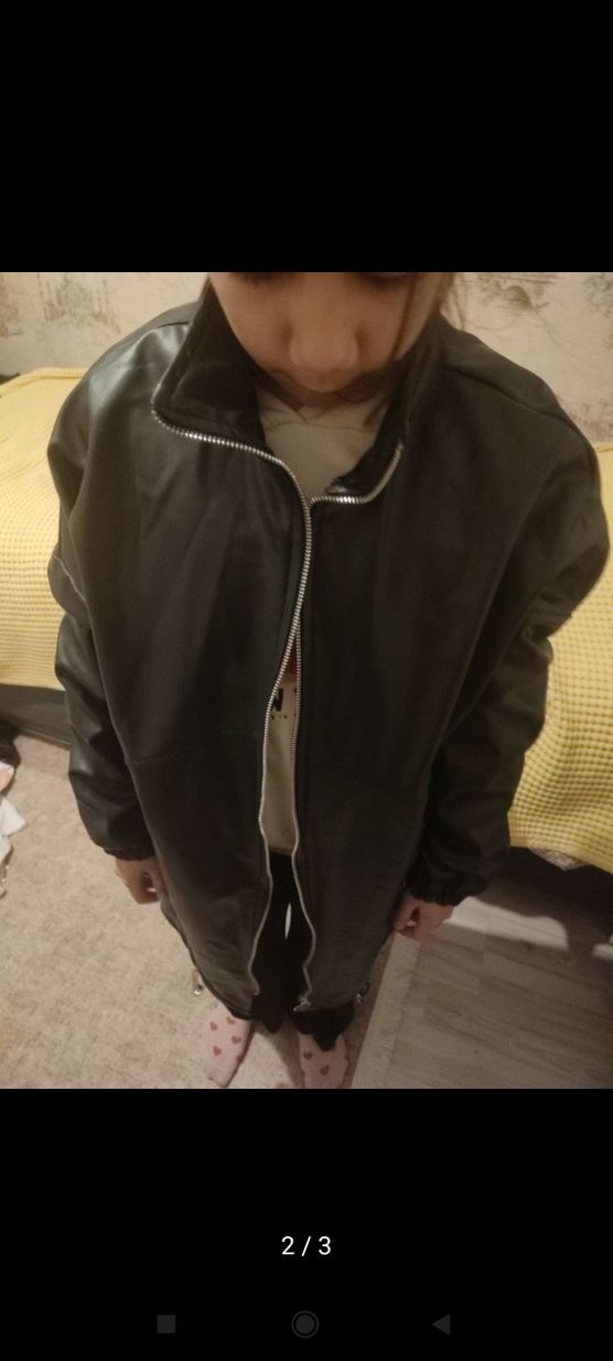 Siyah deri, yüksek yakalı, fermuarlı, uzun kollu, salaş kesim kadın ceket. Günlük sokak stili için uygundur.