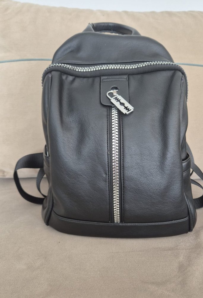 Siyah deri sırt çantası, defosu fotoğrafta var