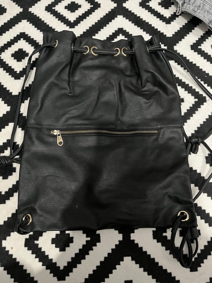 Siyah deri sırt çantası, fermuarlı ön cep ve ipli kapama özelliği ile sokak tarzına uygun, günlük kullanım için ideal.