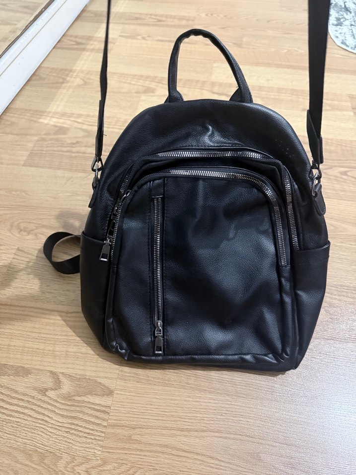 Siyah deri sırt çantası, çoklu fermuarlı bölmeler ve minimalist gotik tarz sunar. Günlük kullanıma uygun, koyu ve desensiz tasarıma sahiptir.