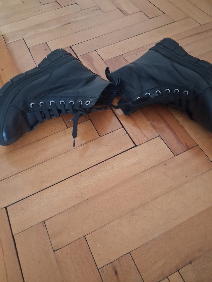 Siyah deri, fermuarlı ve bağcıklı stiletto topuklu botlar, günlük kullanıma uygun grunge punk goth tarzında.