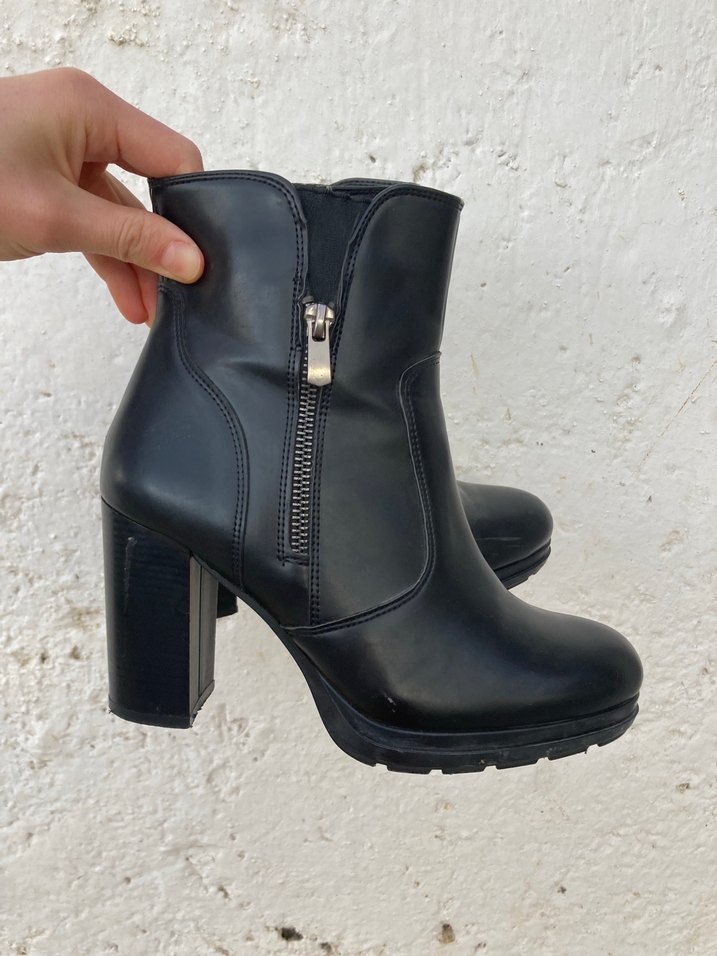 Parlak siyah deri kadın botları, blok topuklu ve yan fermuarlı. günlük şık kombinlere uyum sağlar.36 numarası sayfamda mevcut.