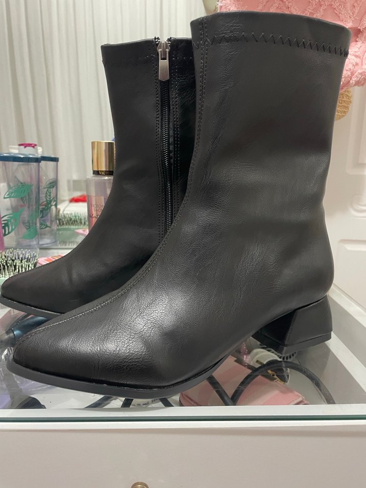 Siyah deri, fermuarlı, topuklu kadın botları. Düz desensiz, gotik ve Paris tarzı etkileri taşıyor.